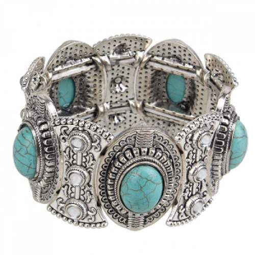 Tibetaans zilveren stretch armband ingezet met glas -stenen en turqouise stenen