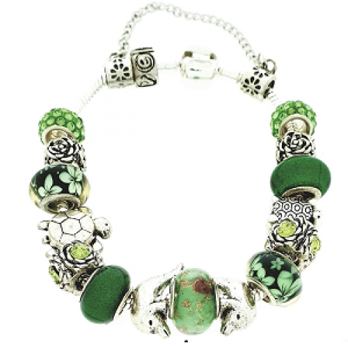 Armband Verzilverd 924 Dolfijn-Schildpad Diverse grootgat kralen met strass-stenen Groen- 23cm Nikkelvrij