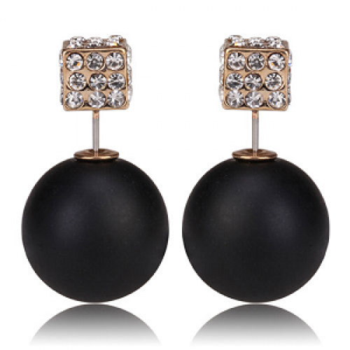 Goldplated Dubbele dots parel oorbellen met vierkant voorkant bezet met crystal kleur: Matt Black Nikkelvrij