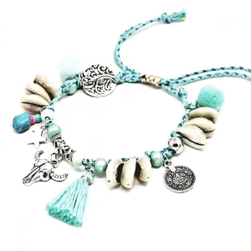 Enkelbandje Handmade Ibiza style Bohemian Pompoen Bedels Schelpjes Howliet Kralen Hout gevlochten koord Turqouise