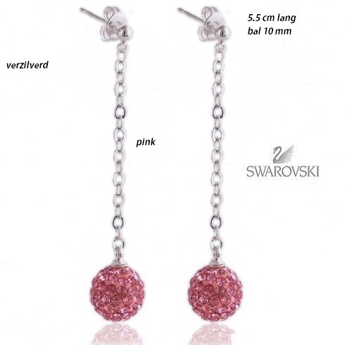 Oorbellen lange zilveren kleur metaal met bollen kralen bezet met Swarovski