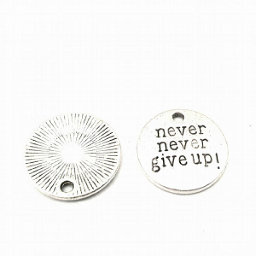 Bedel zilveren metaal rond met tekst: Never Never Give up ! 20 mm doorsnede gat 2 mm per stuk nikkelvrij