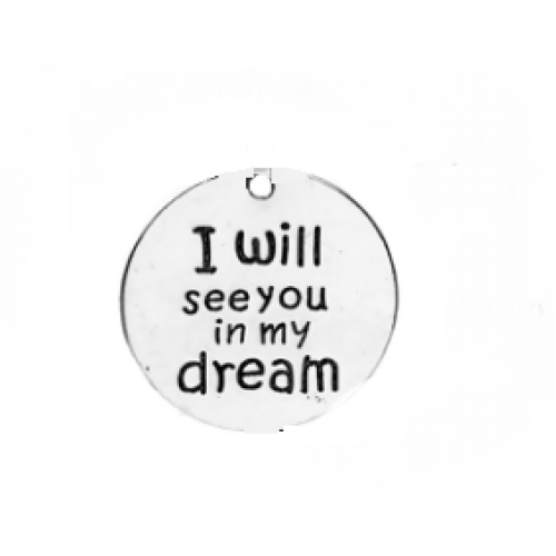 Bedel - rond - 25 mm - gat 1 mm met tekst: I will see you in my Dreams zilveren metaal nikkelvrij - per stuk