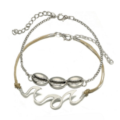 Enkelbandjes set 2 stuks Waxkoord zandkleur Wave - en met kettinkje schelpen verstelbaar nikkelvrij - per set