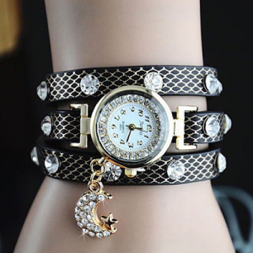 Horloge - goudkleur- kast afmeting: 25mm doorsnede bezet met strass-stenen daaraan een Maan/ster bedel met strass-stenen