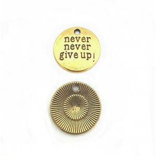 Bedel met tekst - Never give up - rond metaal goud