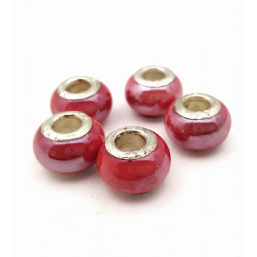 Kraal met groot gat (5mm) porselein rood met kern verzilverd 925 t.b.v. armband of iets anders nikkelvrij