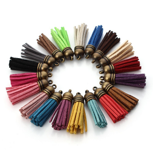 Bedel pu suede kwastje - koffie bruin met bronzen kapje - lengte 3.5 cm - gat 2mm nikkelvrij - per stuk