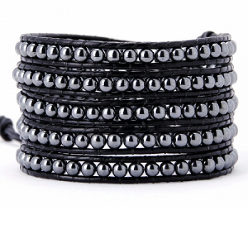 Wikkel-armband Edelsteen kralen Hematiet 4mm lengte 90 cm verstelbaar met rvs knoop leer - echt lederen