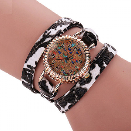 Wikkel-horloge met pu lederen kunststof dierenprint band en kast met bloemen
