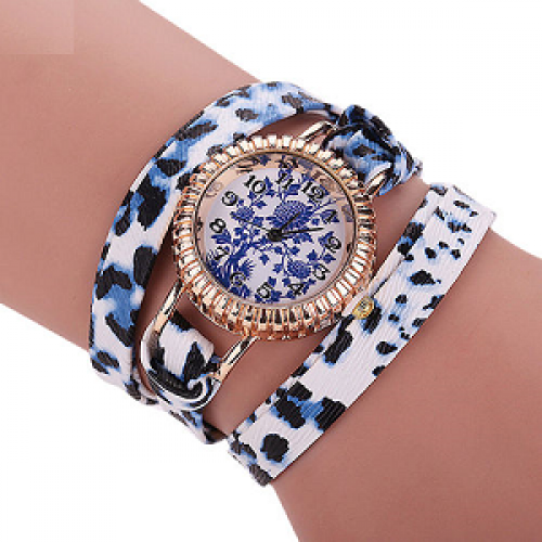 Goudkleur metalen wikkel-horloge met bloemen print - kunststof pu leder